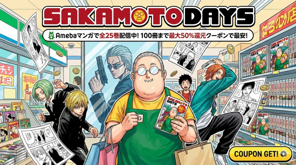 『SAKAMOTO DAYS』(サカモトデイズ)は、Amebaマンガで全25巻が配信中です。新規登録特典の「100冊まで最大50%即時還元クーポン」を使えば、全巻まとめ買いでも実質約5,500〜6,300円相当と、主要電子書籍サービスの中でもトップクラスのコスパで読むこと... -