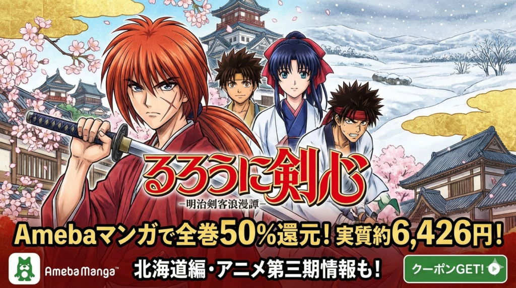『るろうに剣心 -明治剣客浪漫譚-』は電子書籍で全巻配信中です。結論から言うと、Amebaマンガの初回限定100冊50%還元クーポンを使えば、全28巻が実質約6,426円で読めます。本記事では全巻最安の買い方から作品の魅力、最新の北海道編・アニメ第三期情報ま... -