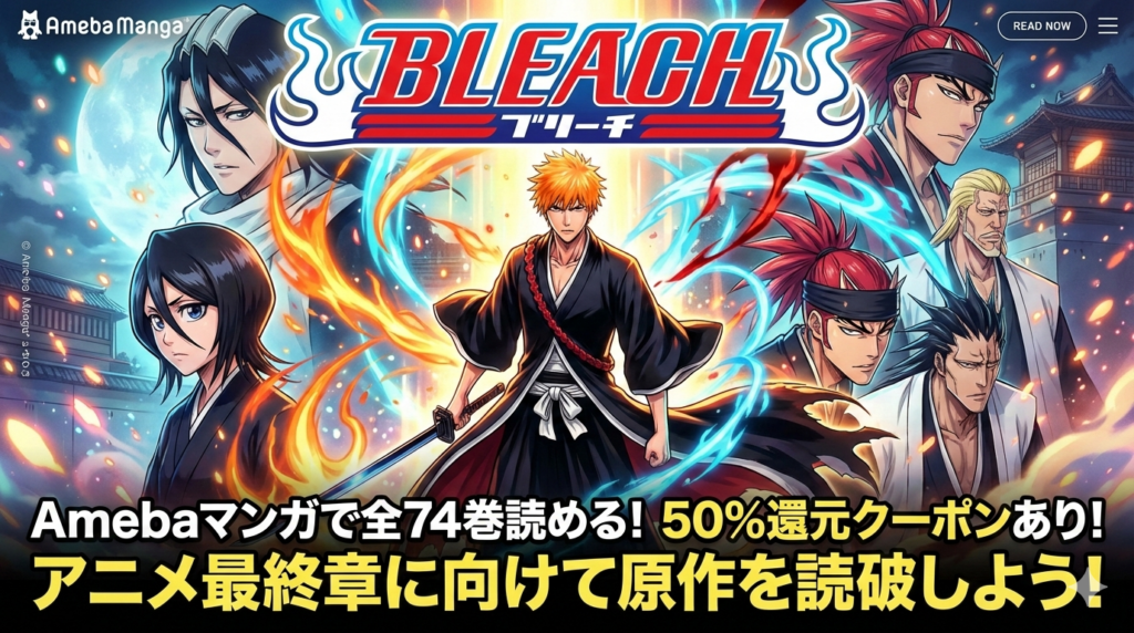 BLEACH(ブリーチ)は全74巻すべてAmebaマンガで配信中です。新規登録でもらえる「100冊まで50%即時還元クーポン」を使えば、全巻を定価約33,967円(税込)のところ実質約20,000〜21,000円で読めます。2026年7月にはアニメ最終クール「千年血戦篇-禍進譚-... -