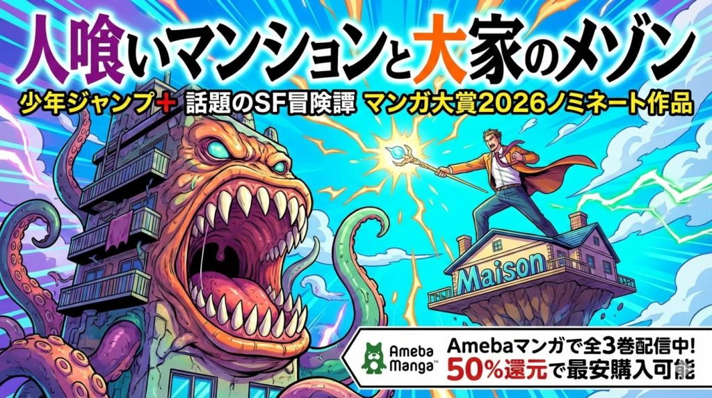 「人喰いマンションと大家のメゾン」は少年ジャンプ+で連載中の話題のSF冒険譚。原作・田中空、作画・あきまのタッグが描く"地球崩壊1秒前"の独創的な世界観が話題を呼び、マンガ大賞2026の二次ノミネートにも選出されました。結論から言うと、全3巻をま... -