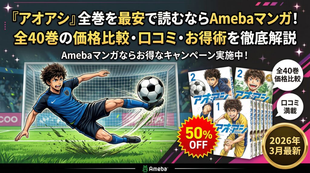 『アオアシ』全巻を最安で読むならAmebaマンガ!全40巻の価格比較・口コミ・お得なまとめ買い術を徹底解説【2026年3月最新】 『アオアシ』全40巻を最安で読みたい方へ。結論から言うと、Amebaマンガの新規登録特典「100冊まで最大50%即時還元」を活用すれ... -