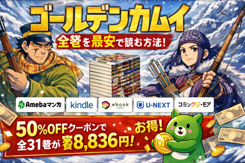 『ゴールデンカムイ』全巻を最安で読む方法|電子書籍5社を徹底比較&Amebaマンガのお得な使い方【2026年3月最新】 『ゴールデンカムイ』を今すぐお得に全巻読むなら、Amebaマンガの新規登録50%即時還元クーポンが最もコスパの高い選択肢です。全31巻・定... -