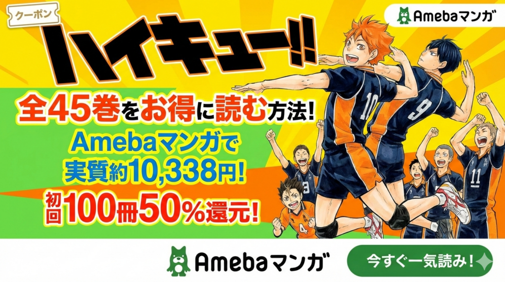 「ハイキュー!!」を全巻お得に読みたい方へ。結論から言うと、全45巻を完全無料で読めるサービスはありませんが、Amebaマンガの初回100冊50%即時還元クーポンを使えば、全巻を実質約10,338円で読破できます。本記事では各電子書籍サービスの価格を比較し、... -