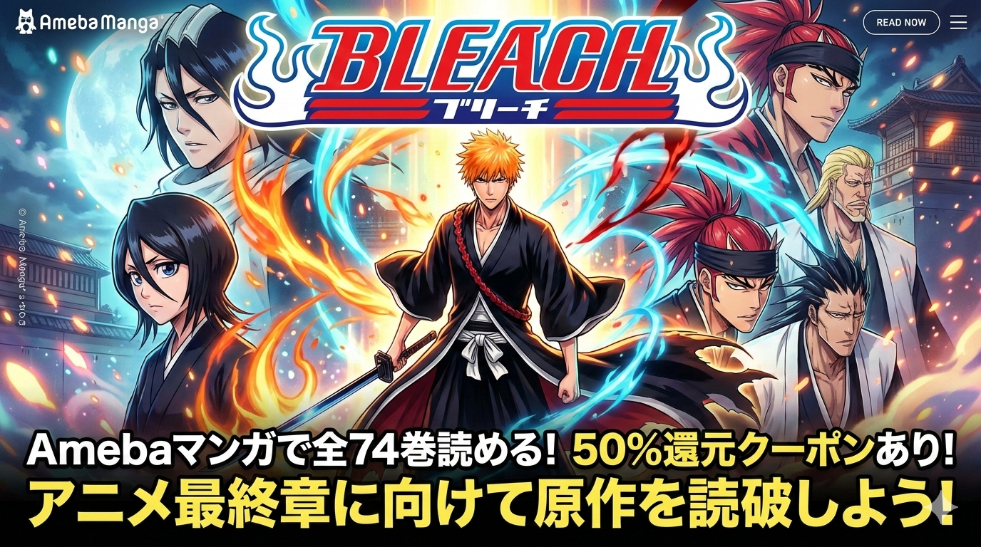BLEACH(ブリーチ)は全74巻すべてAmebaマンガで配信中です。新規登録でもらえる「100冊まで50%即時還元クーポン」を使えば、全巻を定価約33,967円(税込)のところ実質約20,000〜21,000円で読めます。2026年7月にはアニメ最終クール「千年血戦篇-禍進譚-」の放送も決定しており、原作を読むなら今がベストタイミングです。