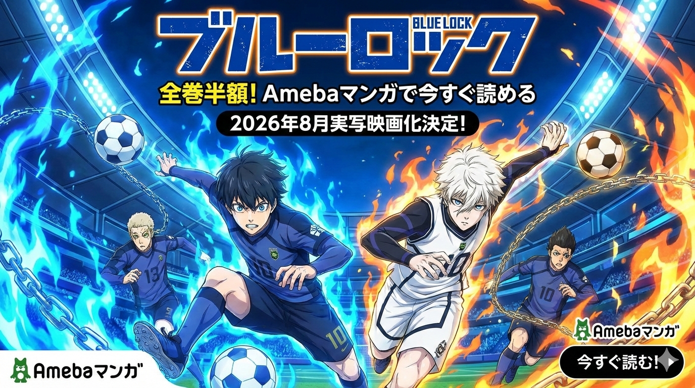 世界累計5,000万部を突破し、2026年8月の実写映画公開でさらなる盛り上がりが期待される『ブルーロック』。全37巻をまとめて読むなら、初回100冊50%即時還元のAmebaマンガが圧倒的にお得です。定価21,978円のところ実質約11,000円で全巻を手に入れられるうえ、スピンオフ『EPISODE 凪』もあわせて購入できます。アニメ2期の作画に物足りなさを感じた方も、迫力ある原作漫画ならきっと満足できるはずです。この機会にぜひ、Amebaマンガで『ブルーロック』の世界を一気読みしてみてください。