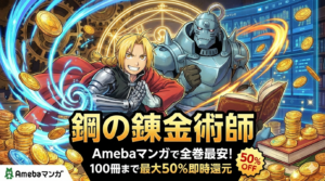 Amebaマンガ最大の強みは、新規登録時に使える「100冊まで最大50%即時還元」クーポンです。この特典は文字通り100冊分に適用されるため、BORUTO -TWO BLUE VORTEX-の全7巻はもちろん、前作「BORUTO -NARUTO NEXT GENERATIONS-」全20巻や「NARUTO」全72巻をまとめて買っても余裕があります。他のサービスでは1冊限定や割引上限が設定されていることが多いのに対し、Amebaマンガは冊数の上限が100冊と圧倒的です。