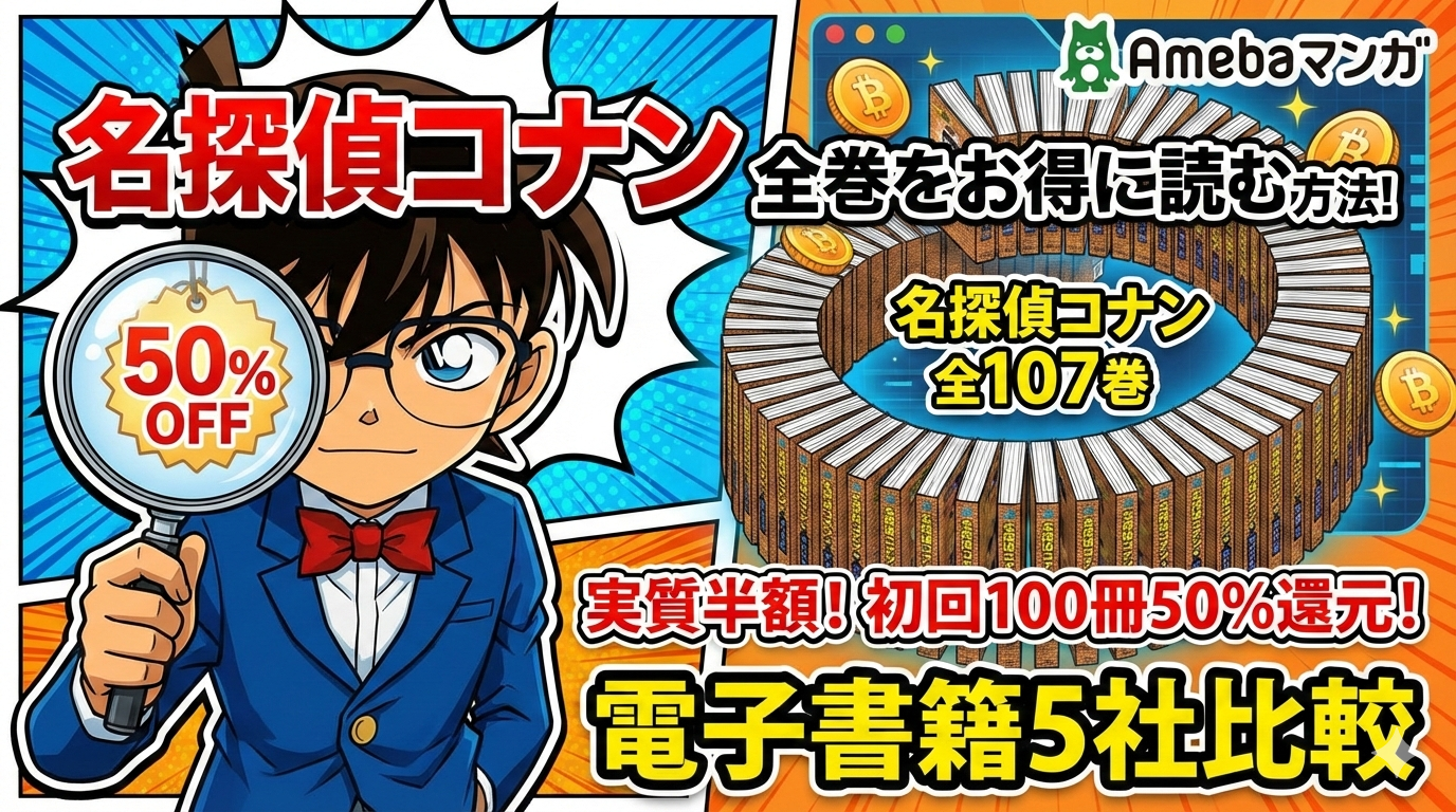 「名探偵コナン」全107巻を最もお得に読むなら、Amebaマンガの初回100冊50%還元クーポンが最強です。定価62,381円の全巻セットが実質約31,190円になり、他社と比較しても圧倒的なコスパを誇ります。この記事では電子書籍5社の価格を徹底比較し、最安で全巻を揃える方法を解説します。