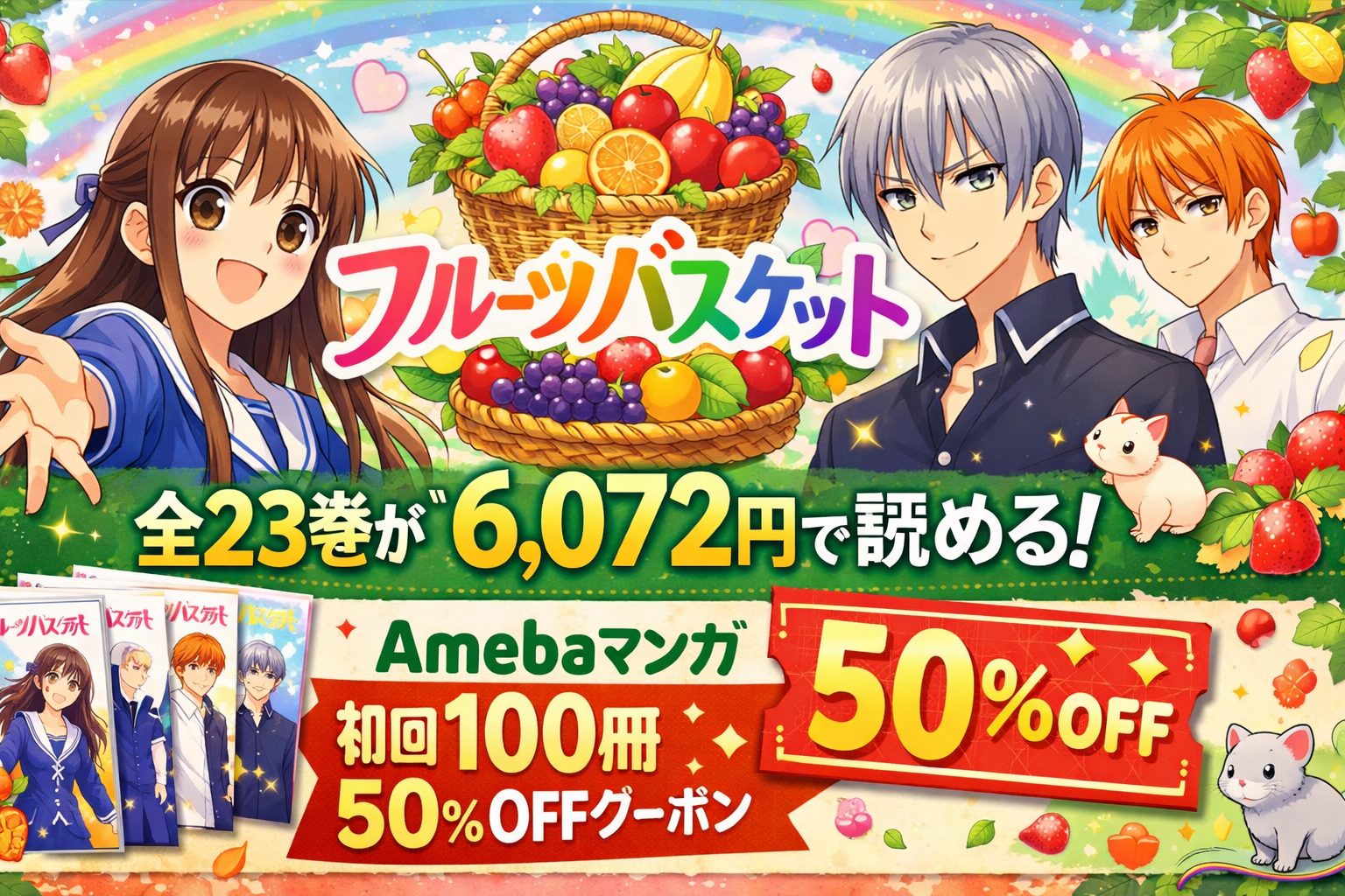 『フルーツバスケット』を全巻お得に読みたい方へ。結論から言うと、Amebaマンガの初回100冊50%即時還元クーポンを使えば、全23巻が実質約6,072円で購入可能です。本記事では電子書籍5社の価格を徹底比較し、最安で読む方法を解説します。