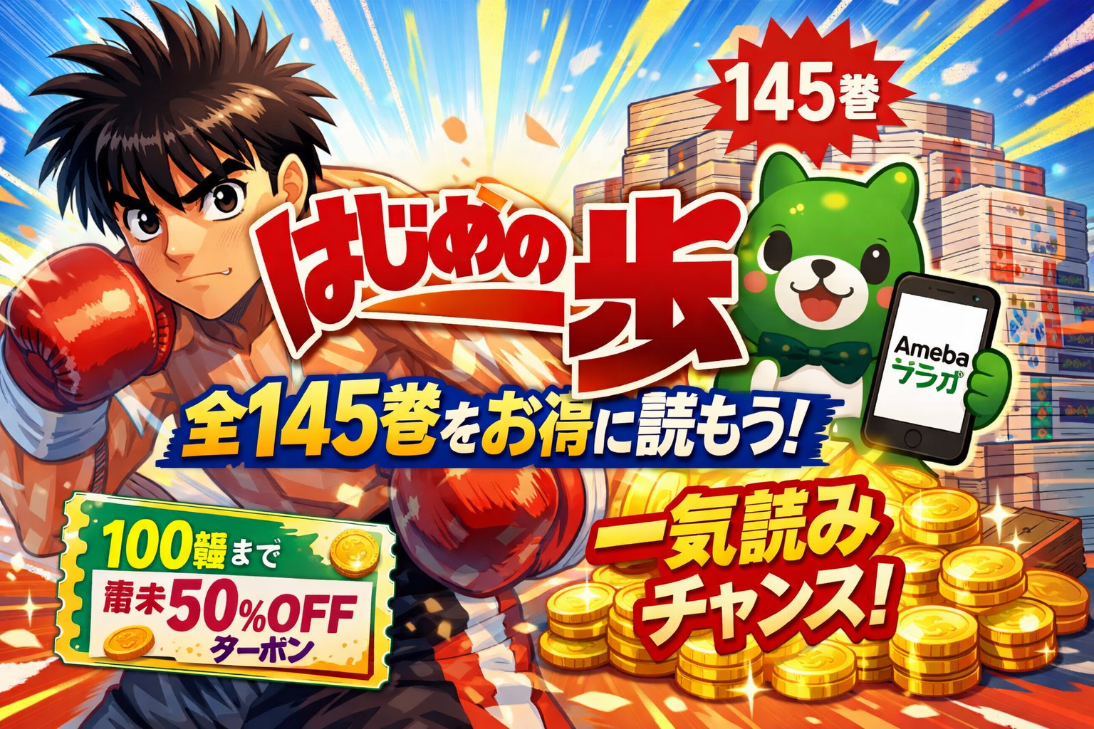「はじめの一歩」全145巻を最もお得に読む方法をお探しですか?結論から言うと、Amebaマンガの新規登録で使える「100冊まで最大50%即時還元クーポン」を活用すれば、全巻定価約78,300円のところを大幅に節約して一気読みできます。この記事では、2026年2月時点の最新配信状況・全巻価格比較・口コミ評判まで徹底的にまとめました。