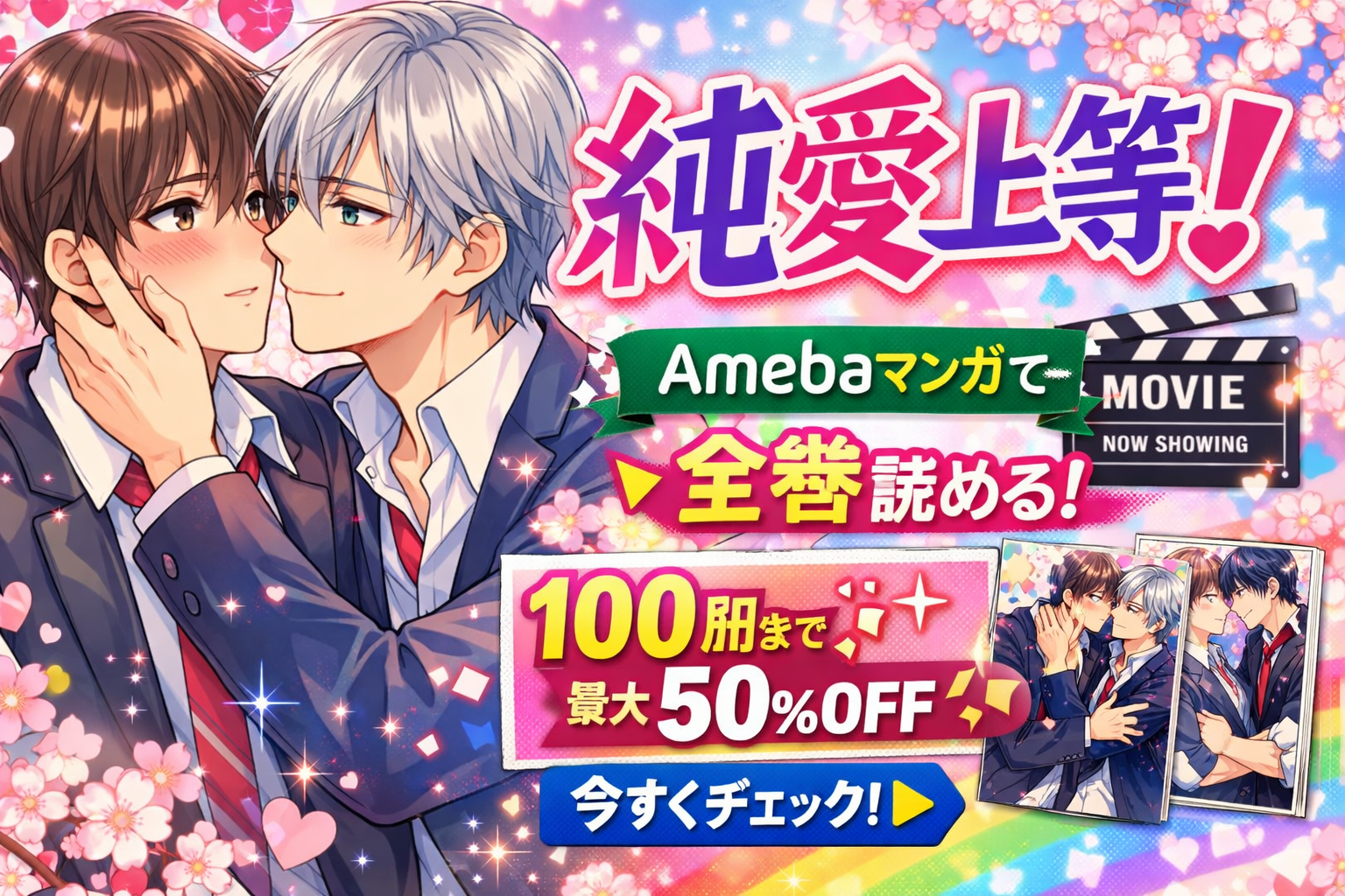 2026年2月13日に実写映画が公開され話題沸騰中のBL漫画『純愛上等!』は、Amebaマンガで単行本版(全2巻)・分冊版(全13巻)ともに配信中です。新規登録の100冊50%即時還元を使えば、全巻を実質約1,073円で読めます。この記事では電子書籍5社の価格比較、作品の見どころ、口コミ・評判まで徹底的にまとめました。