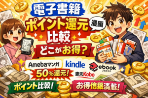 Kindle Unlimitedとコミック.jpは、「読み放題」と「ポイント制」というサービス形態の違いから、最適なユーザー層がはっきり分かれるサービスです。大量の本を試し読みしたいならKindle Unlimited、読みたい漫画を確実に手元に残したいならコミック.jpがそれぞれの強みを発揮します。そして、シリーズ漫画の全巻まとめ買いでコスパを最大化したいなら、100冊50%即時還元のAmebaマンガが最も合理的な選択肢です。