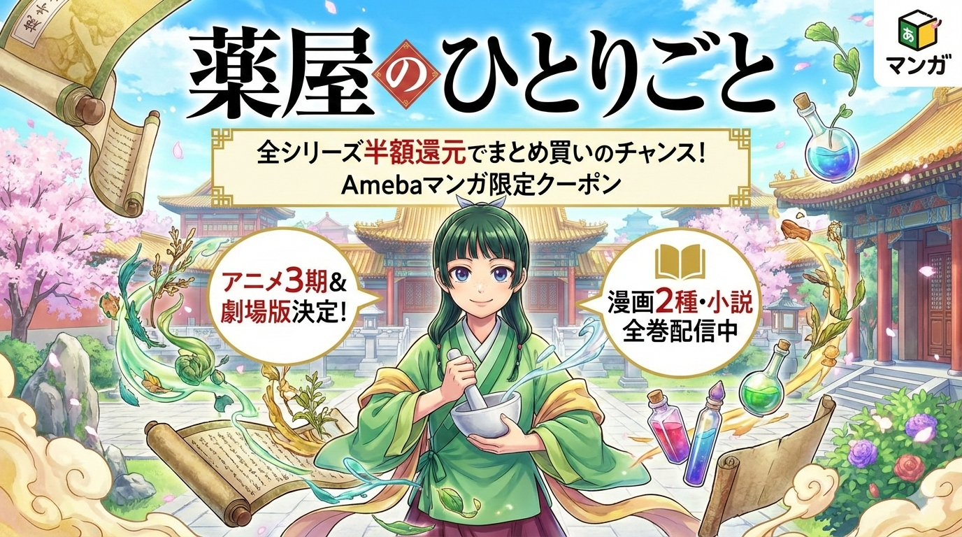 Amebaマンガでは、『薬屋のひとりごと』の漫画2種類(サンデーGX版・ビッグガンガン版)および原作小説(ヒーロー文庫版)の3シリーズすべてが配信されています。新規登録時に付与される「100冊まで最大50%即時還元クーポン」を活用すれば、全巻まとめ買いでも大幅にコストを抑えられます。