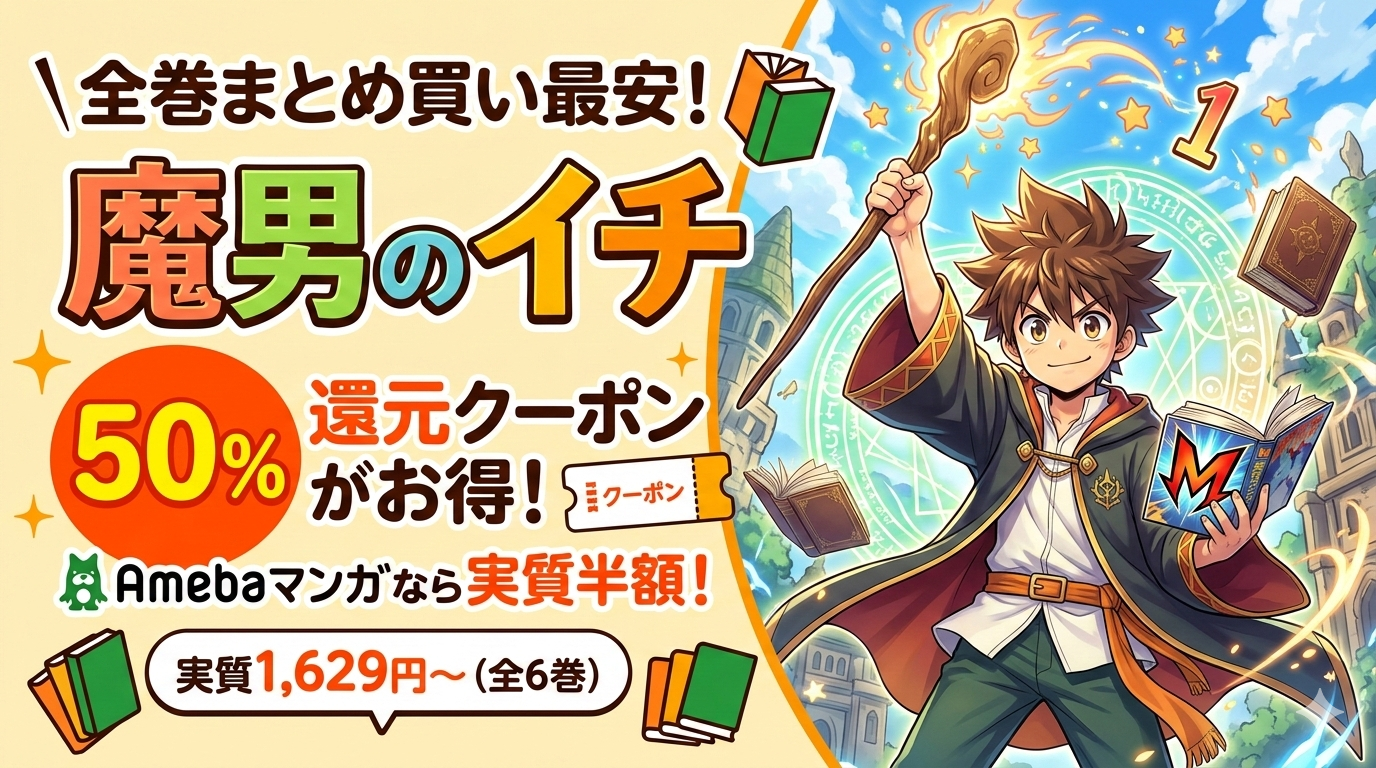 上記の比較から明らかな通り、Amebaマンガの50%コイン還元クーポンが全6巻まとめ買い時のコスパで最も優れています。ebookjapanも複数回使える70%OFFクーポンがありますが、1冊あたりの割引上限があるため全巻トータルではAmebaマンガの還元率に及びません。特に「魔男のイチ」のように巻数がまだ少ない作品をまとめ買いする場合は、100冊まで適用できるAmebaマンガの初回クーポンが圧倒的に有利です。