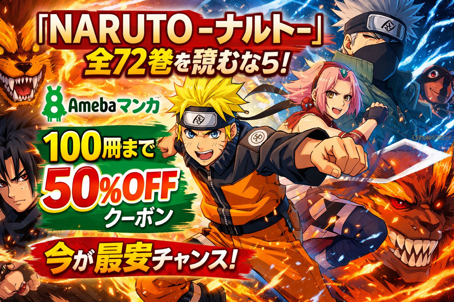『NARUTO -ナルト-』を全巻読むなら、Amebaマンガの新規登録で使える「100冊まで50%即時還元クーポン」が最もお得です。定価39,222円(税込)の全72巻が、実質約26,000円相当で購入可能。本記事では、各電子書籍サービスの価格比較から作品の見どころ、口コミまで徹底的に解説します。