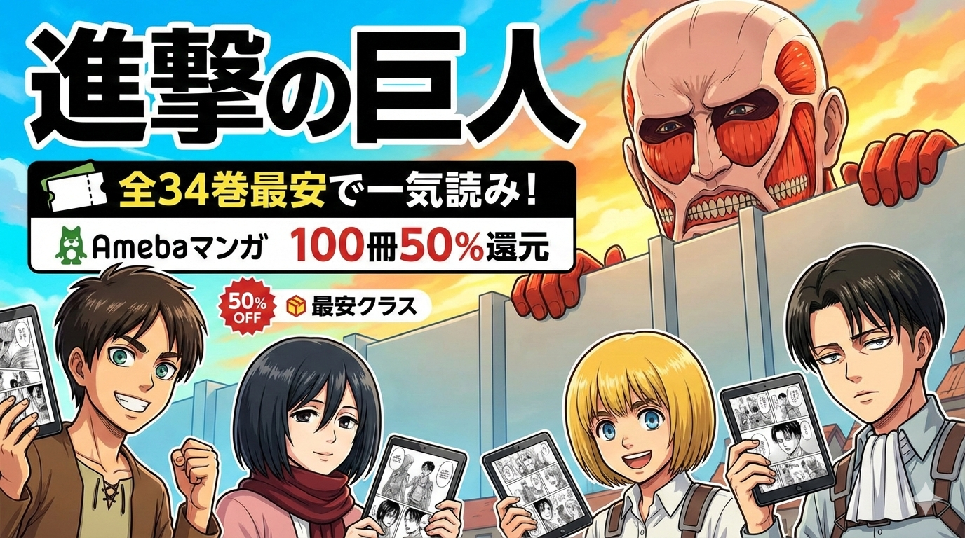 『進撃の巨人』全34巻を電子書籍で一番安く読む方法をお探しですか?結論から言うと、Amebaマンガの初回限定100冊50%即時還元クーポンを使えば、全34巻が実質約11,600円前後で購入でき、主要5社のなかで最安クラスです。完結済み作品だからこそ、一気読みに最適なまとめ買い情報を徹底解説します。