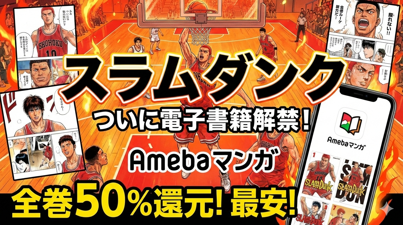 「スラムダンク」は2025年6月についに電子書籍が解禁され、新装再編版(全20巻)がAmebaマンガをはじめとする主要サービスで読めるようになりました。結論から言えば、全巻まとめ買いで最もお得なのはAmebaマンガの「100冊まで50%即時還元クーポン」を活用する方法で、定価約12,592円のところ実質約6,296円で購入できます。