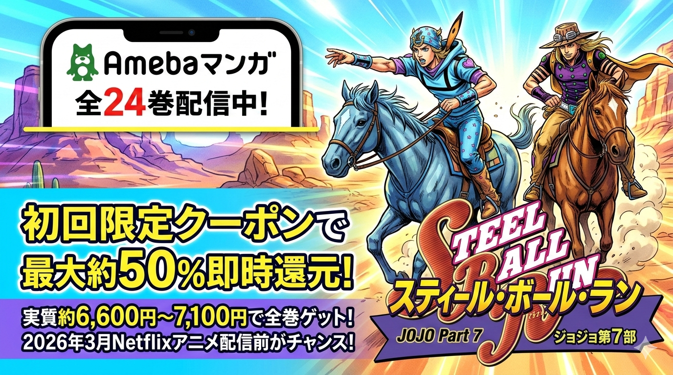 『STEEL BALL RUN(スティール・ボール・ラン)』はAmebaマンガで全24巻すべて配信中です。初回限定の100冊まで最大50%即時還元クーポンを使えば、通常約11,856円の全巻セットが約6,600〜7,100円で購入可能。2026年3月19日のNetflixアニメ配信直前の今こそ、原作を最安でまとめ買いするチャンスです。