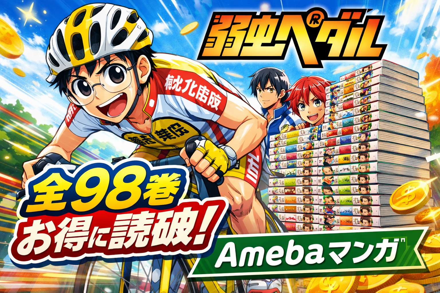 「弱虫ペダル」を全巻まとめ買いしたいけど、どこで買うのが一番安いのか迷っていませんか?結論から言うと、Amebaマンガなら全98巻が配信中で、初回限定の100冊50%即時還元クーポンを使えば実質約25,000円で全巻読破できます。これは他のどの電子書籍サービスと比較しても、98巻をまるごと買うなら最安クラスです。